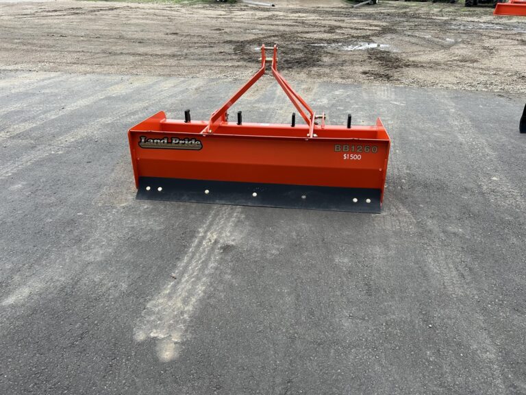 2022 Kubota Land Pride BB1260 60” Box Blade, the perfect tool for your leveling needs! Designed for Category 1 3-point hitch or Quick-Hitch System mounting, this robust box scraper is ideal for tractors in the 30 hp range. With forward and reverse cutting edges and a sturdy 15-3/8″ moldboard, it excels at ripping, leveling, finish grading, and backfilling tasks. The rear backfill blade makes quick work of trenches or foundations, ensuring a smooth, professional finish. Built to handle heavy loads without losing shape.